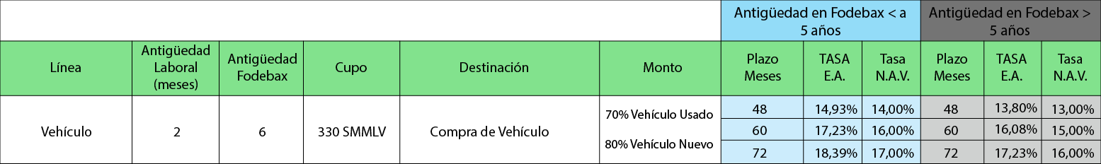 Esta línea de crédito le permite la adquisición de un vehículo nuevo o usado, hacer reparaciones o pagar impuestos. Se presta hasta el 70% del avaluó comercial del vehículo; (lista Fasecolda). Disponible para carro o moto.